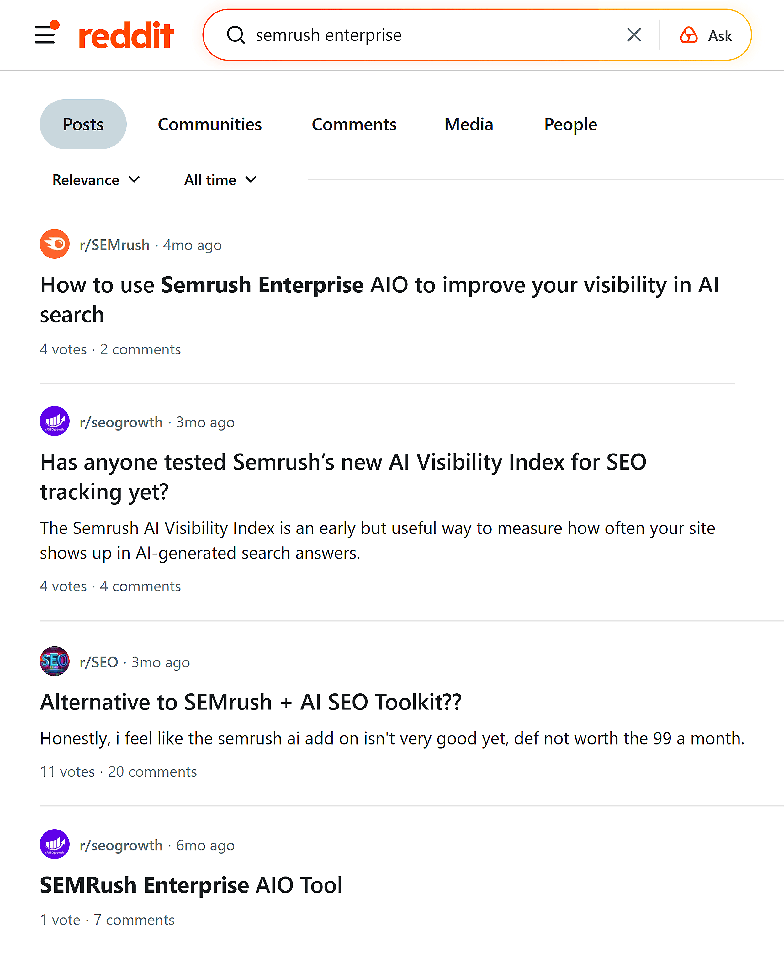For example, r/SEMrush keeps its biggest updates (like the AI Visibility Toolkit launch) and company news pinned.