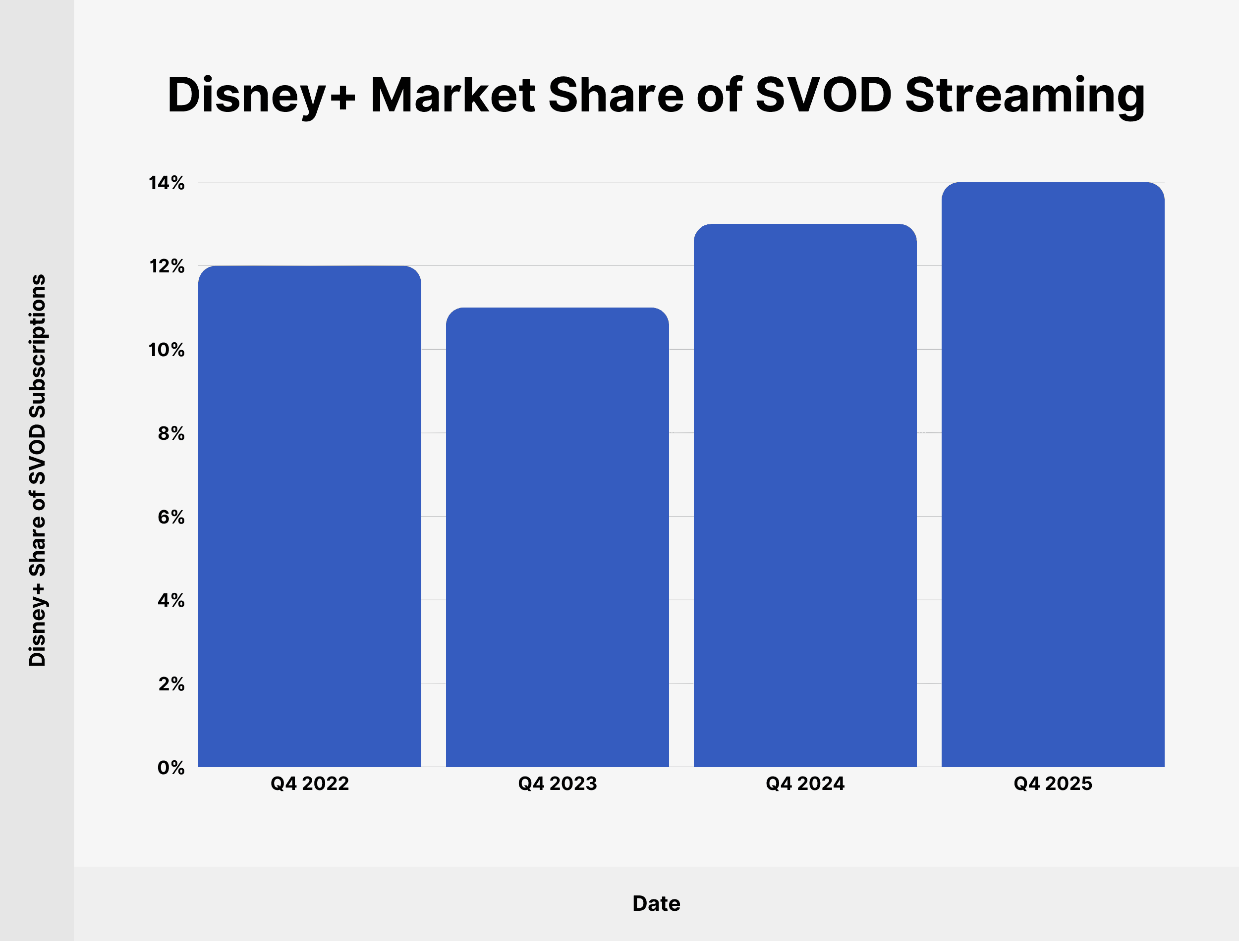 As of Q4 2025, Disney+ accounts for 14% of SVOD (subscription video on demand) subscriptions in the US. That’s up 1% since Q4 2024.