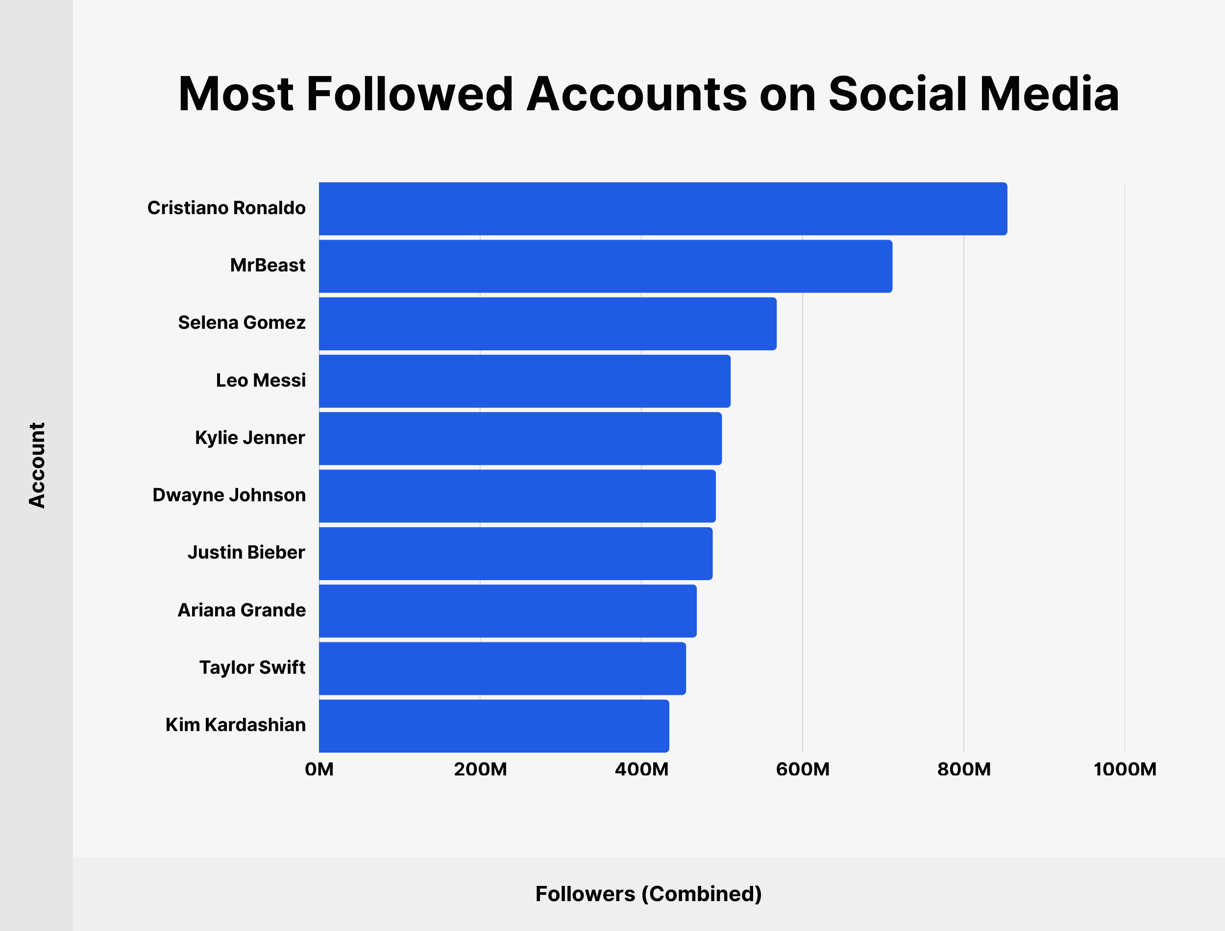 | Rank | Account | Followers (Combined) | Instagram Followers | TikTok Followers | X Followers | YouTube Subscribers |