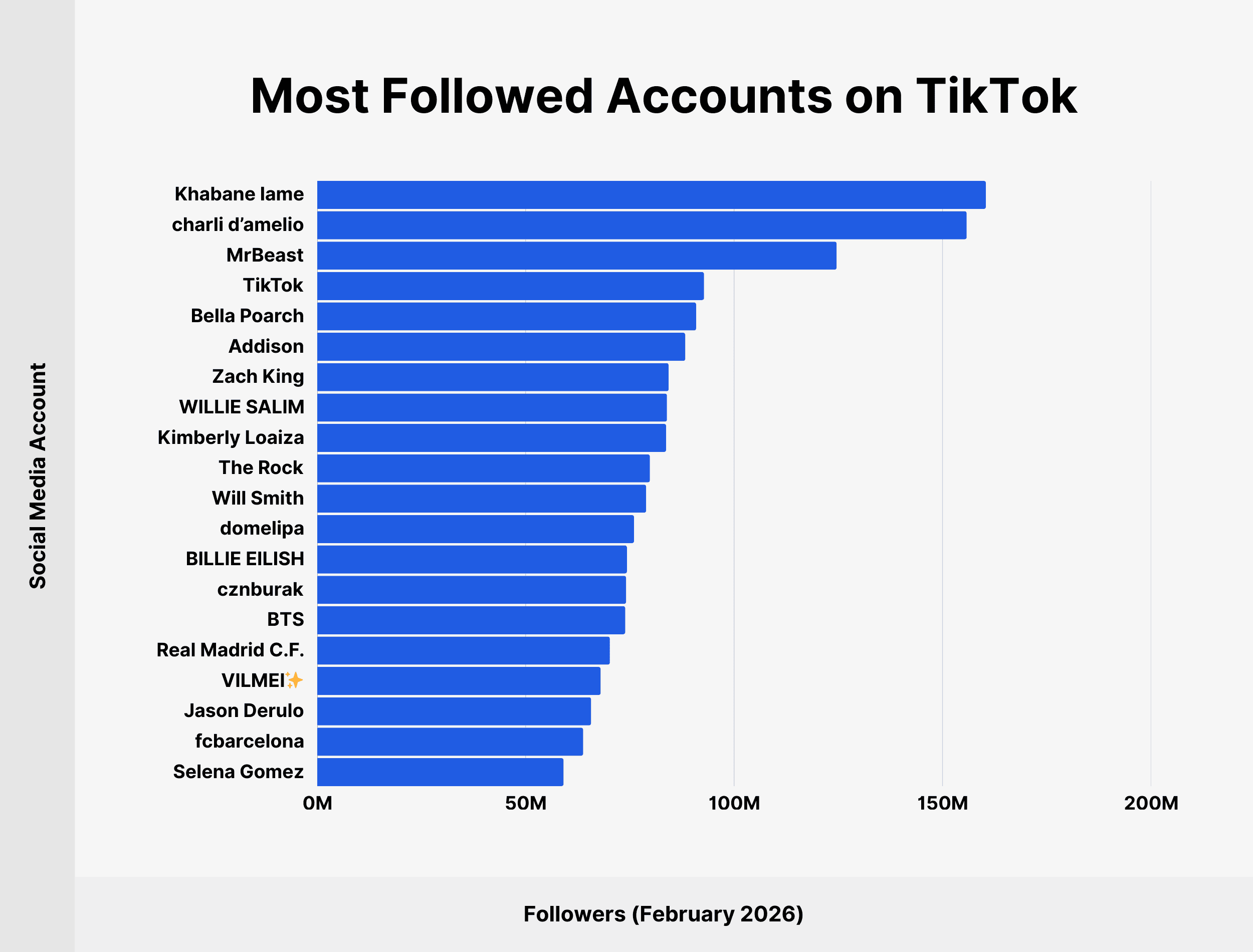 | Rank | Username | Followers (Feb 2026) | Followers (Jan 2025) | Followers (Jan 2024) |