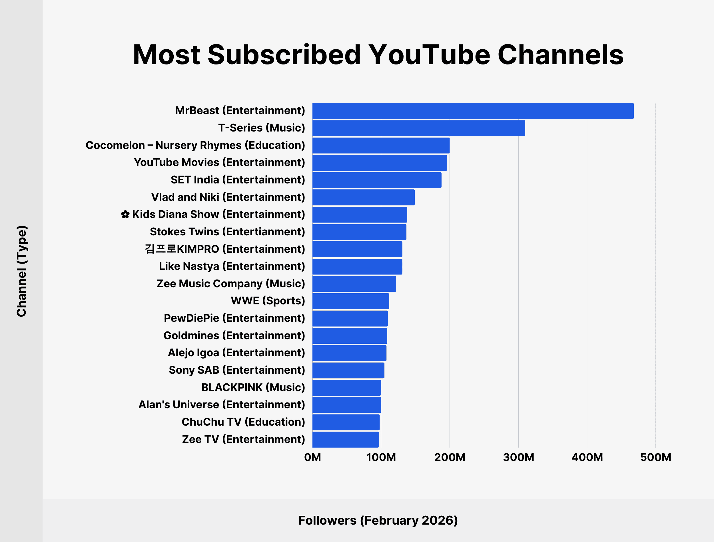 | Rank | Channel (Type) | Feb 2026 Subscribers | Jan 2025 Subscribers | Jan 2024 Subscribers |