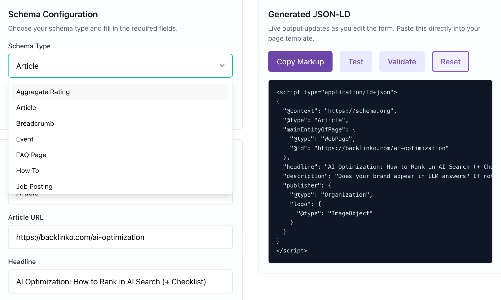 Generate schema markup that helps your pages stand out in Google search results and AI answers. Choose a schema type, fill in your details, and get ready-to-use JSON-LD code. Start here.