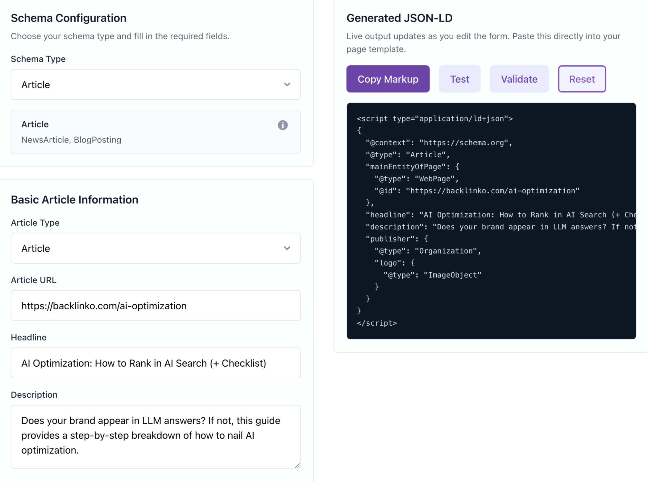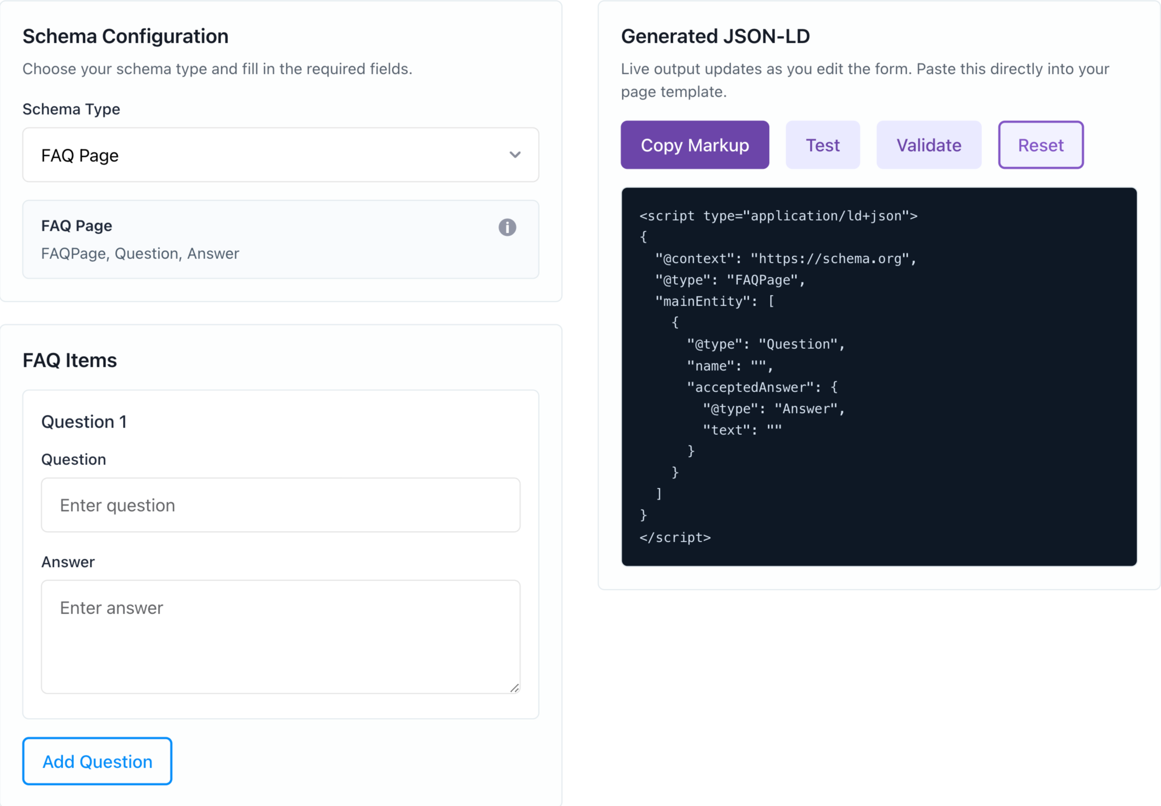 Type into the form and watch your JSON-LD update live. No coding, no formatting, no extra steps.
