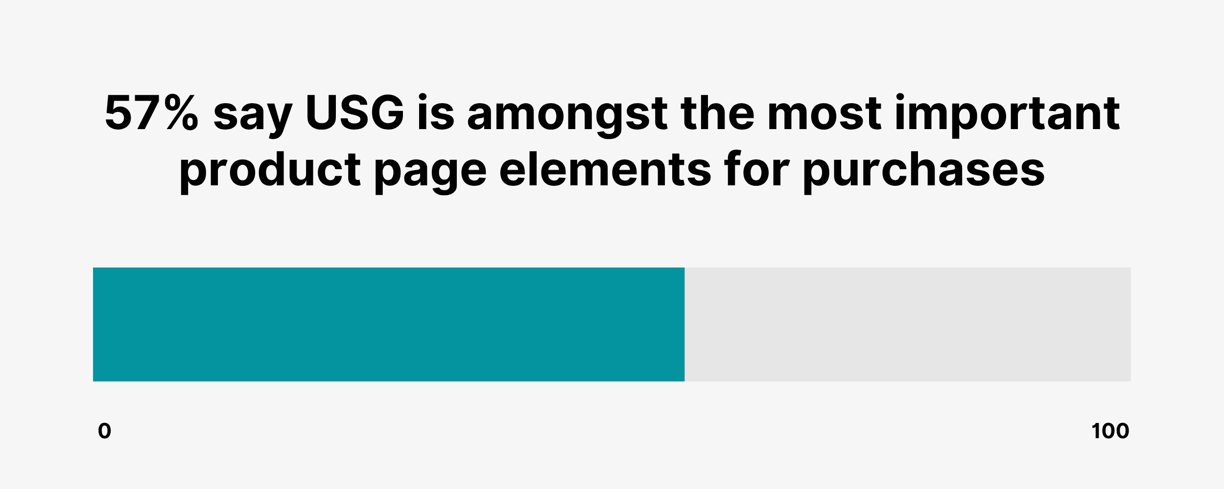 - 57% say customer ratings, reviews, and user-generated content are the most important product page element for completing a purchase – Salsify