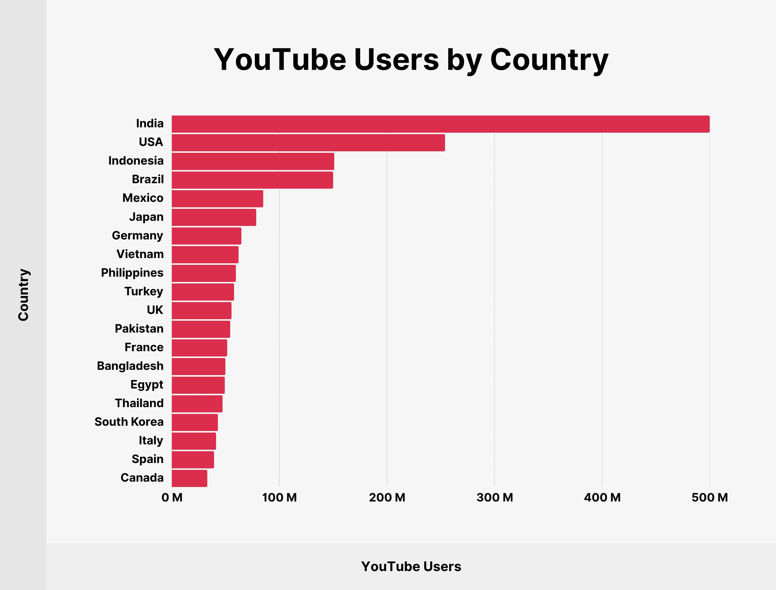Sorted by country, India has the most YouTube users. The USA follows, with Indonesia, Brazil, and Mexico next.